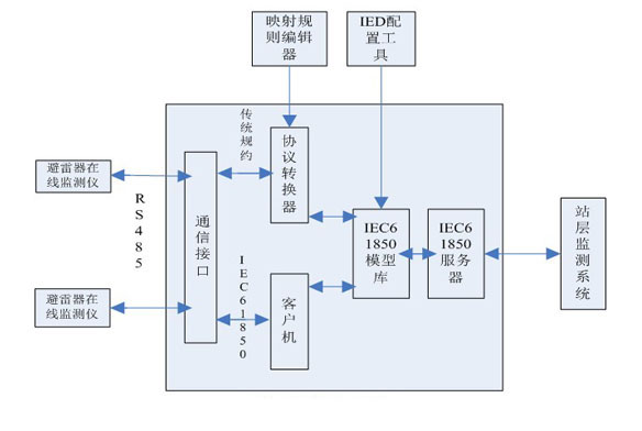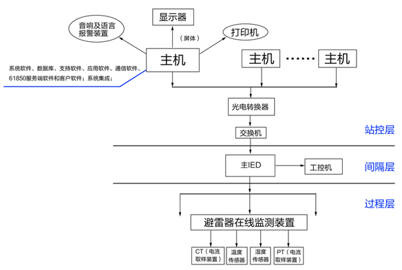 二、避雷器在線監(jiān)測儀接IED與后臺主機相連,實現(xiàn)數(shù)據(jù)上傳。